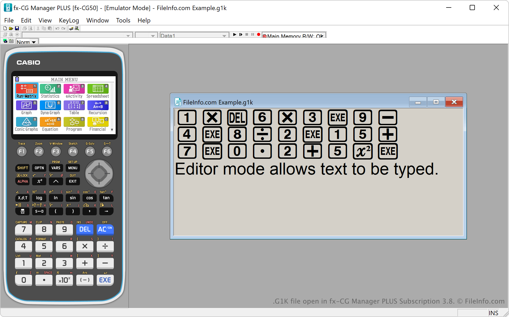 NOTE: fx-CG Manager PLUS Subscription allows you to record key-log files in Emulator and Editor modes. Emulator mode only records keystrokes, while Editor mode records keystrokes and allows text to be entered (it also allows you to delete recorded keystrokes).