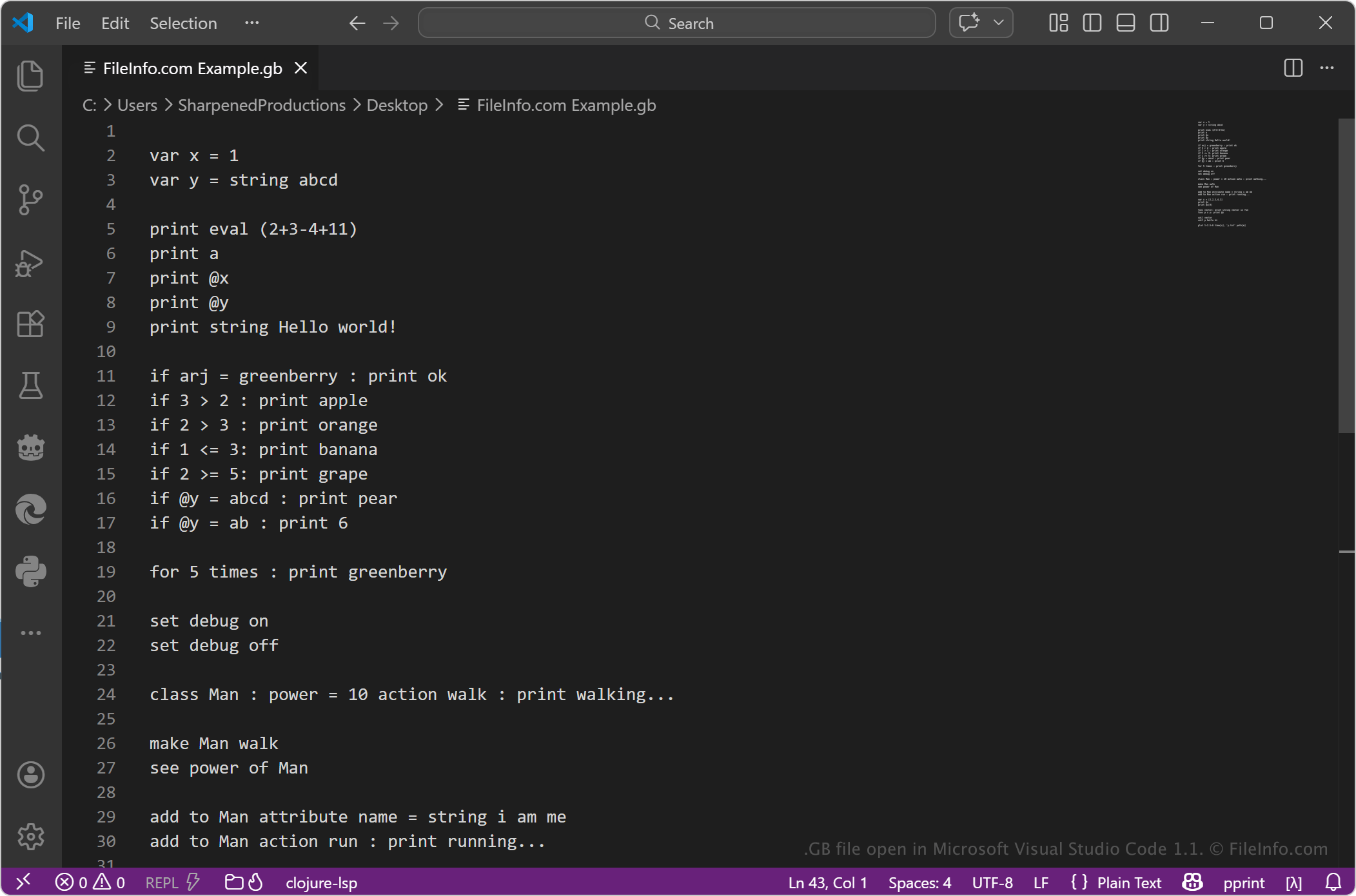 GB files typically contain concise instructions written in the GreenBerry syntax. The language emphasizes executing tasks quickly with minimal code, making it useful for scripting, automation, and experimenting with Python operations. Developers, students, and users who work with Python may use GB files to simplify repetitive tasks or test small pieces of logic without writing full Python scripts.