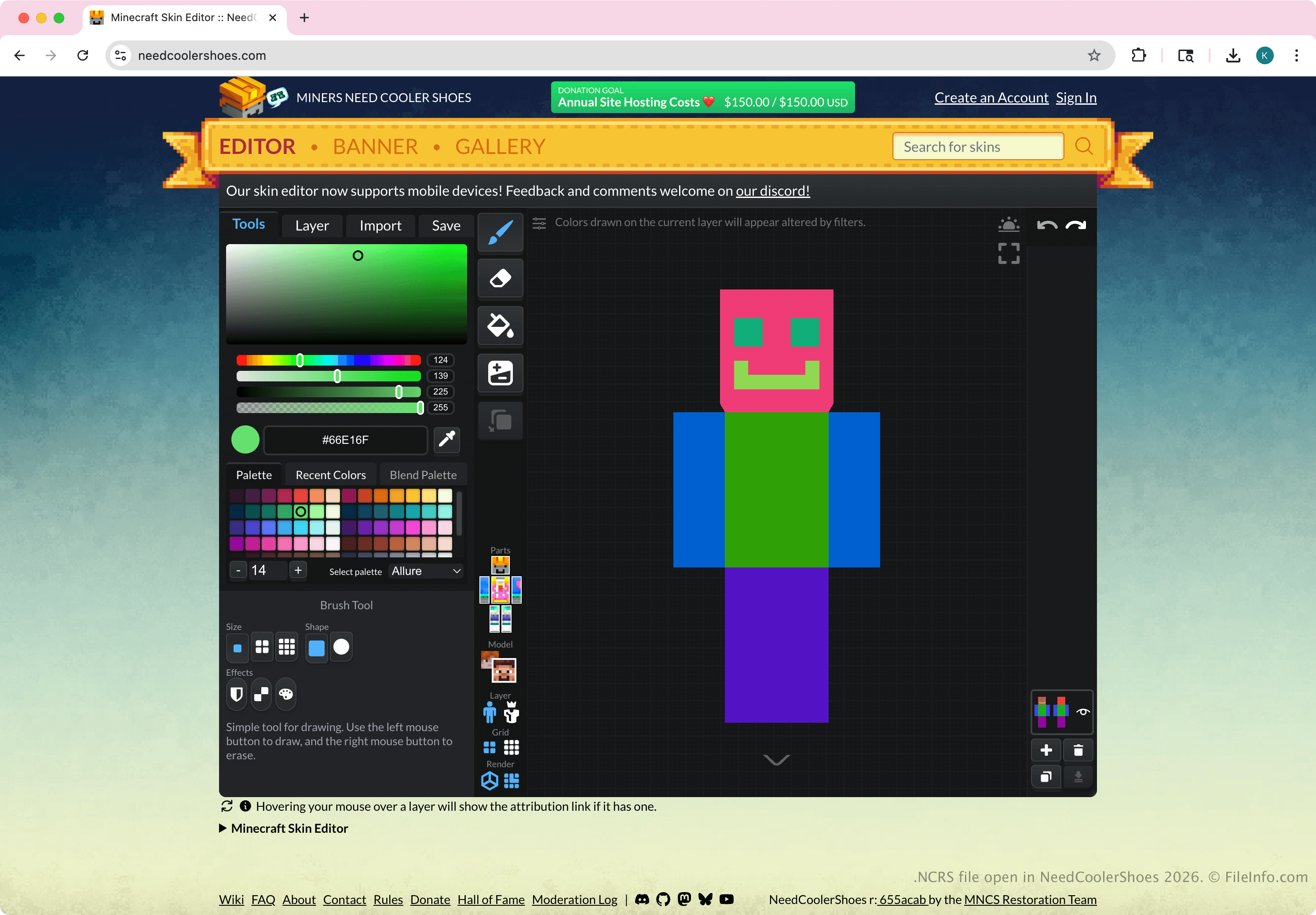 Minecraft players and skin creators create NCRS files by selecting Save in the NeedCoolerShoes online editor, and then choosing Export Project (.ncrs). The file does not store a standard Minecraft skin image and is not intended for use inside Minecraft itself. Before a user can add a skin to Minecraft, the user must export it from the editor as a standard PNG image that matches Minecraft's skin requirements.